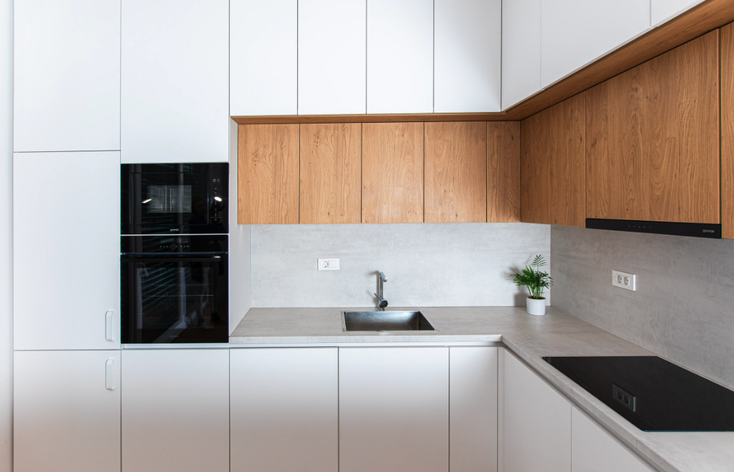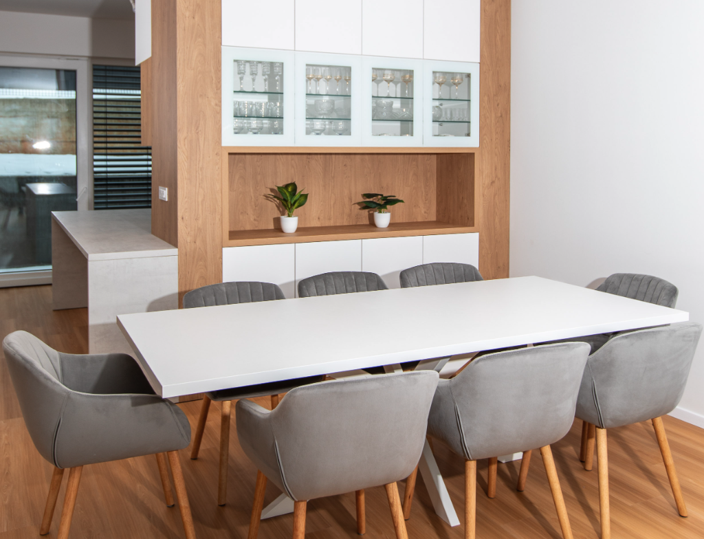 Celotna oprema je izdelana v kombinaciji dveh barv: osnovne bele, ki deluje sveže in elegantno ter hrastovega furnirja, ki dodaja prostorom občutek topline. Kombinacija deluje moderno in elegantno, a hkrati domače. Prostorna kuhinja je oblikovana v obliki črke U. V nizkih omarah so veliki predali, ki omogočajo pregledno shranjevanje posode ali živeža. Hladilnik in pomivalni stroj sta optično zakrita z belimi ličnicami omar. Viseče omare so v dveh globinah: v nižjih so priročno shranjena posoda in živila, ki jih dnevno uporabljamo, v višjih, ki segajo do stropa, pa lahko shranimo stvari, ki jih potrebujemo bolj občasno. Pult osvetljujejo LED luči, ki so diskretno umeščene pod viseče omarice. Del kuhinjskega pulta služi tudi kot t.i. šank, kjer lahko družinski član na hitro nekaj prigrizne ali posedi ob klepetu s tistim, ki pripravlja obrok. Jedilnica vsebuje veliko mizo za osem oseb in omaro do stropa z nišo in steklenimi vitrinami.