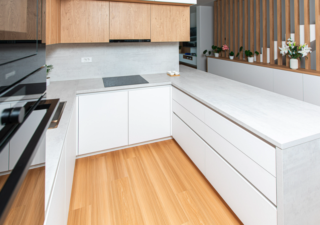 Z odločitvijo za opremo po meri si je družina ustvarila svetlo, odprto in moderno stanovanje po svojih željah. Vsak delček stanovanja pa je tudi prostorsko maksimalno izkoriščen in zasnovan tako, da nudi družini kar največje udobje.