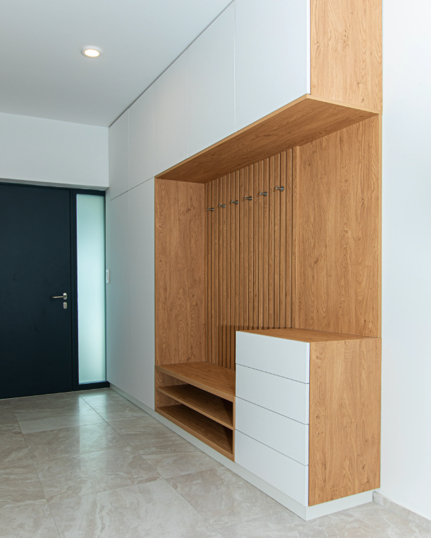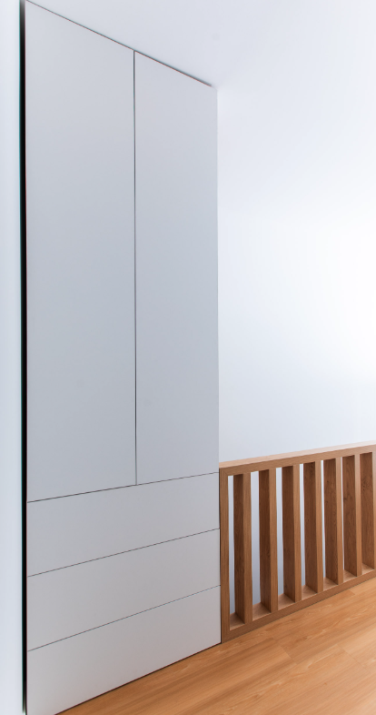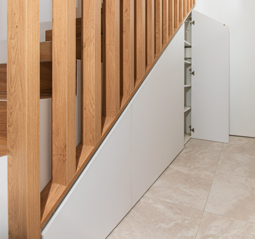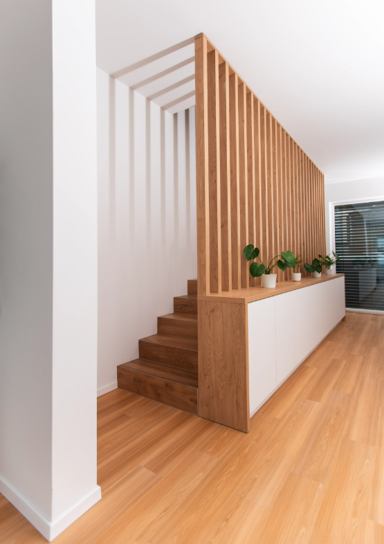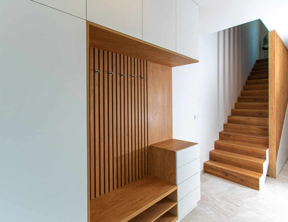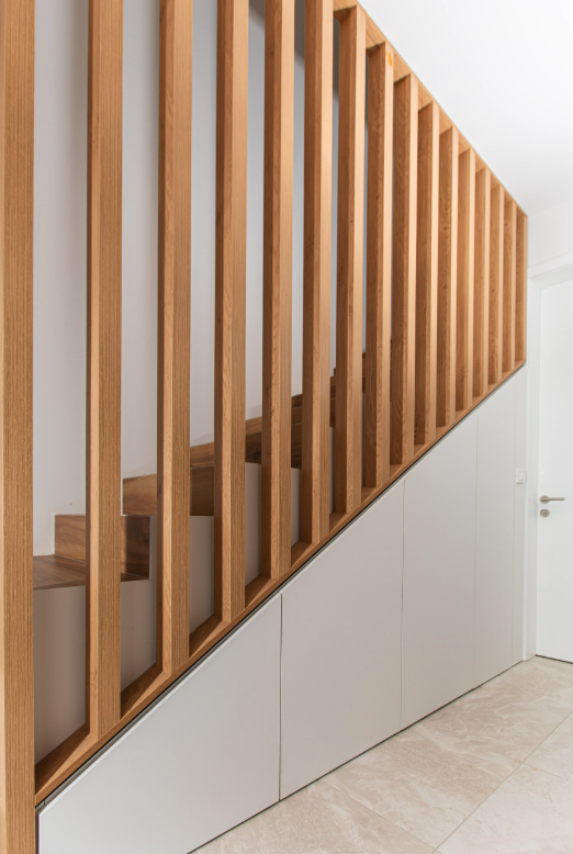Klasično stopniščno ograjo nadomeščajo vertikalne lesene letve, pod katerimi so nizke omare, ki nudijo obilo prostora za shranjevanje. Skupaj tvorijo zanimiv vizuelni element, ki loči bivalni del od stopnišča. Element letvic se ponovi tudi kot obloga na steni s TV ekranom. Kombinacija lesenih hrastovih letvic in pohištva v kombinaciji bele barve in hrastovega furnirja zaznamuje tudi spalni del hiše in predprostor. Prostor ob vhodu je dobro izkoriščen za shranjevanje garderobe z visoko omaro do stropa, izdelano po meri, v kombinaciji s klopjo, garderobno steno in nižjim predalnikom. Shranjevalnih prostorov v hiši ali stanovanju nikoli ni preveč, zato je v hiši dobro izkoriščen tudi prostor pod stopnicami, kjer so omare umeščene v celotno poševnino pod njimi. Vse te lastnosti les uvrščajo med priljubljene materiale za sodobne pisarne, saj prispevajo k bolj zdravemu in produktivnemu delovnemu prostoru.