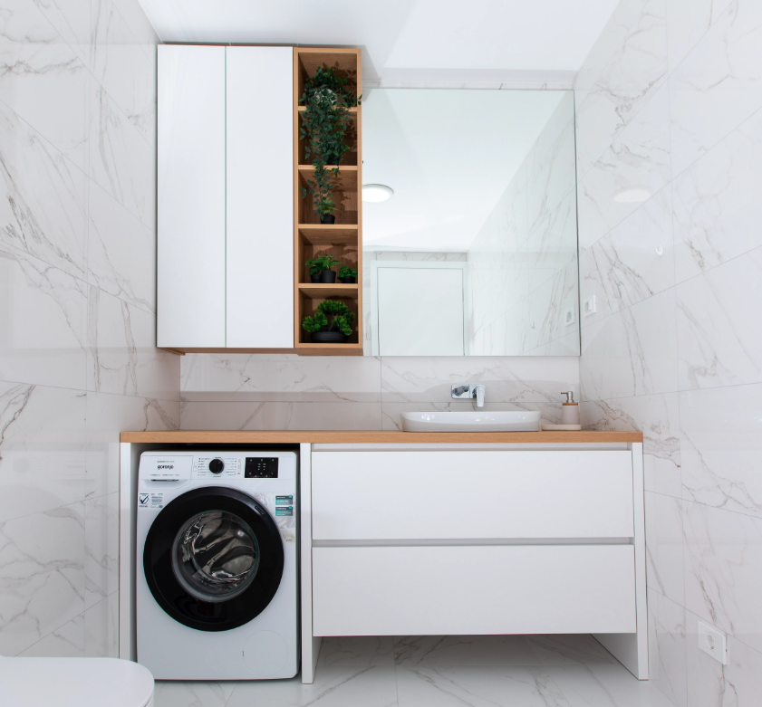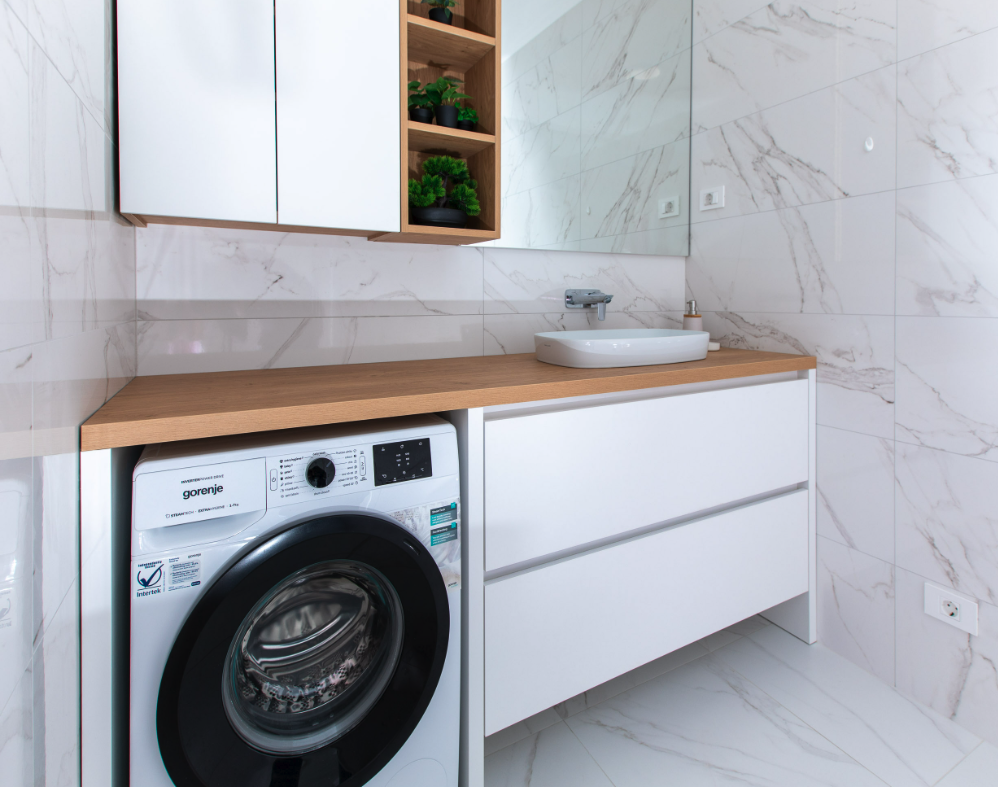 Kopalnica je svetla in elegantna s pultom, pod katerega smo umestili prostoren predalnik in pralni stroj. Nad umivalnikom so po celi širini stene in do stropa umeščeni viseča omarica z ogledalom in odprto nišo.